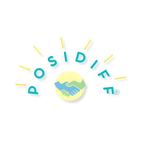 Logo avec une poignée de mains dans un cercle, entouré du mot "POSIDIFF" et des lignes jaunes illustrant des rayons.