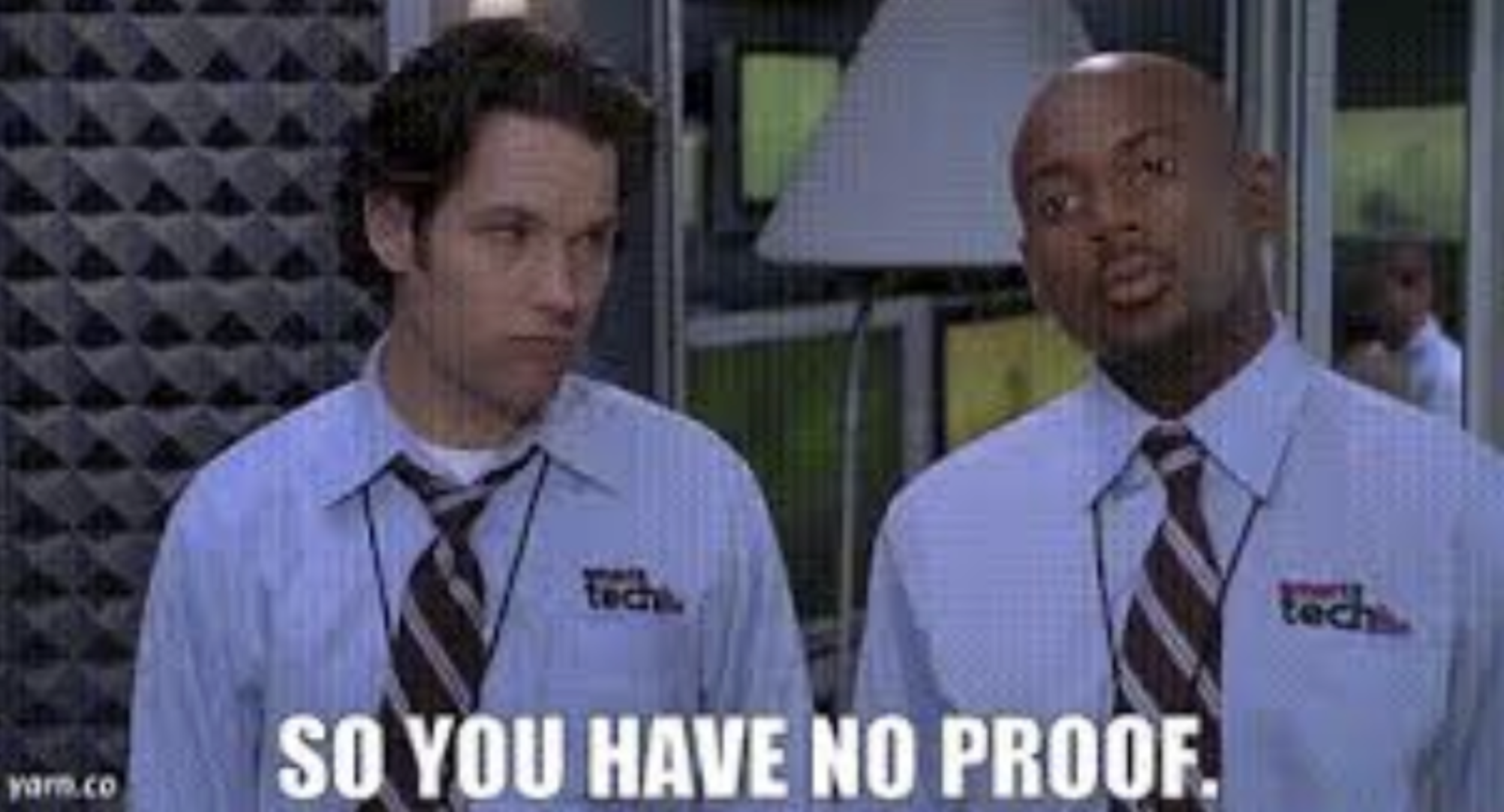 Deux hommes en chemises avec cravates, légende "SO YOU HAVE NO PROOF."